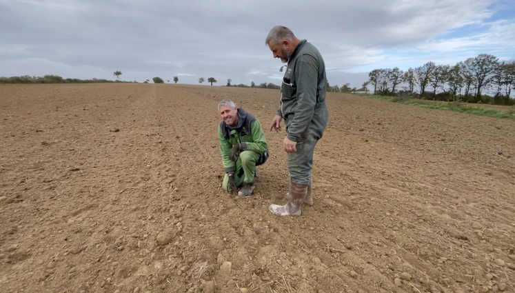 Des conditions de semis au top, cette semaine, pour la Cuma de Chazé-sur-Argos : "on ne sème pas dans la poussière, on a eu de l'eau et ça a humidifié un peu le terrain, et puis il y a de la matière en surface, des débris, qui permettent d'éviter la formation de croûte de battance. Que ça soit pour les conditions et pour la date de semis, on est à l'optimum", se réjouit l'éleveur Mickaël Bauland, qui délègue tous ses semis à la Cuma de l'Argos.