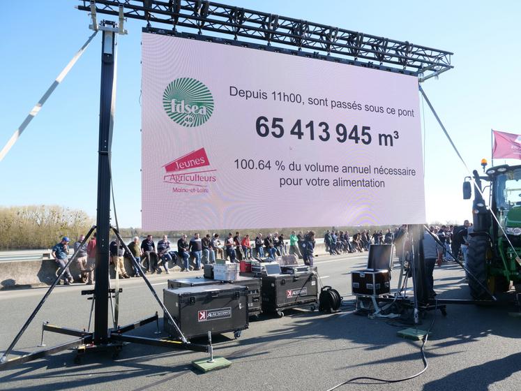 L'accès à la ressource en eau ne concerne donc pas seulement les agriculteurs de la vallée (lire aussi en page 4), mais l'ensemble des exploitations du département. "Les besoins annuels en irrigation sont en moyenne de 54 millions de m3 et de 11 millions de m3 pour l'abreuvement des animaux", estime la FDSEA 49. Un volume de 65 millions de m3 qu'il faudrait pouvoir mettre en réserve lors des excès d'eau. Sous le pont justement, la Loire s'écoule avec un débit encore proche des 5 000 m3/seconde atteint à la station de Montjean-sur-Loire lors des récentes inondations. Un écran géant affiche le volume d'eau accumulé en temps réel. En moins de quatre heures, les besoins pour l'usage agricole sont couverts.