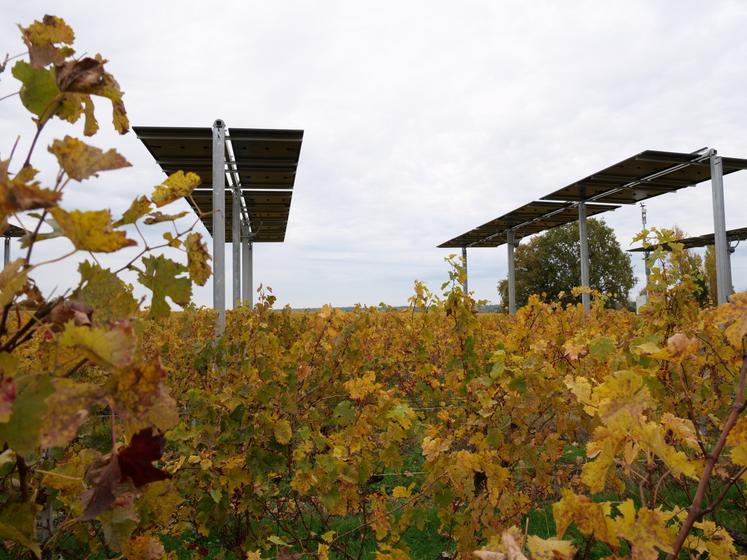 Depuis avril, à Brissac Loire Aubance, une surface de 500 m2 de cabernet franc est équipée d'une centrale agrivoltaïque d'une puissance de 30 kWc, qui couvre environ 1/3 de la surface. Baptisé Vitivolt, ce démonstrateur a été implanté dans une parcelle du domaine Château la Varière, de la maison Ackerman, appartenant au groupe Terrena. "Il s'agit du premier démonstrateur agrivoltaïque en vigne de tout le Val de Loire, expliquait lors de son inauguration, mercredi 29 octobre, David Métivier, administrateur Terrena et président de LVVD (Loire viti vini distribution), la filiale spécialisée en viticulture de la coopérative. Avec le changement climatique, la vigne est très sensible à différents aléas, le gel, la grêle, les stress hydriques. On a besoin d'apporter des solutions aux viticulteurs. Ce modèle d'agrivoltaïsme peut protéger la vigne des aléas climatiques, permettre de diminuer l'empreinte carbone de l'exploitant en produisant de l'électricité bas carbone directement sur l'exploitation et apporter une source de diversification".