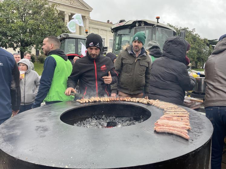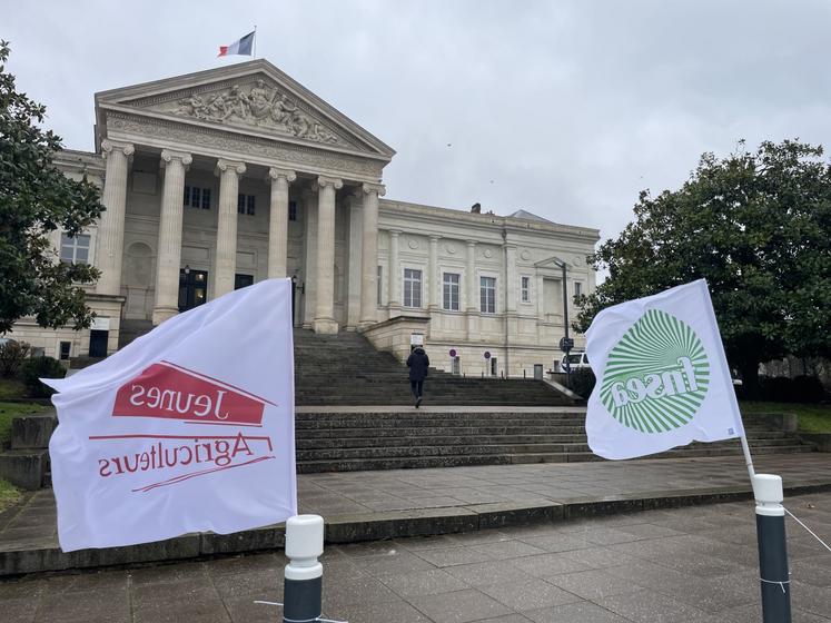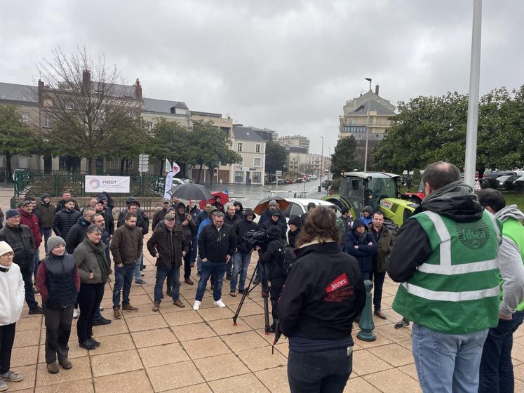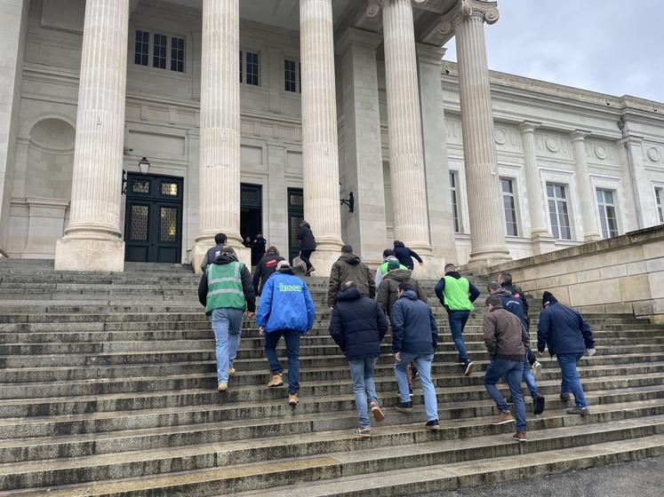 Jeudi 8 janvier à 13h30, devant le tribunal d'Angers, Fabien Cadeau, Médéric Sauvage et Antoine Goislard attendent le début de leur audience. Ils sont appelés à comparaître pour entrave à la circulation sur une voie publique entre le 29 janvier et le 1er février 2024. Mais les deux entrepreneurs et le jeune agriculteur ne sont pas seuls. Sur la place, près de 80 personnes, adhérentes de la FDSEA49, JA49 et de la fédération des EDT49, sont mobilisées, exprimant leur soutien. « Ce mouvement agricole de 2024 était légitime, il venait d'une colère qui est encore là aujourd'hui : ce serait une injustice totale si vous étiez condamnés », déclare le secrétaire général de la FDSEA 49, Anthony Ménard.